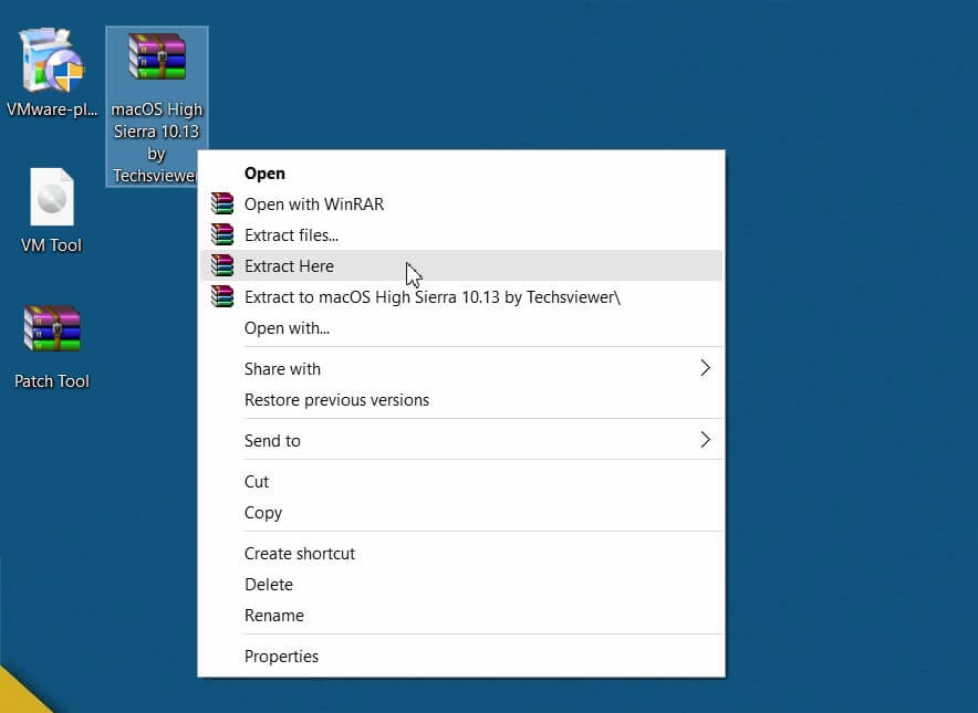 Download and install Winrar or 7Zip, then right-click on “macOS High Sierra.rar” and select Extract Here